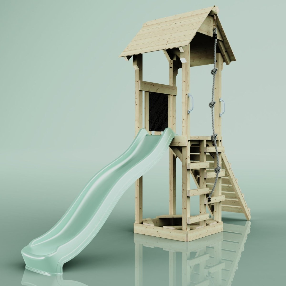This version of the PolarPlay Climbing tower is accessed by either the staggered ladder, ramp or for the more adventurous, knotted climbing rope. There is an 8ft slide from one side and Monkey bars on the other creating an activity packed playset in a compact footprint.